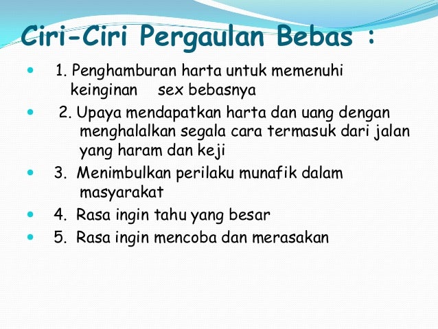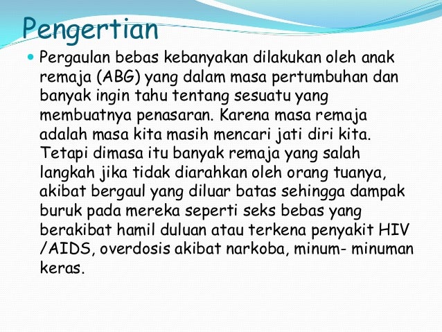 - Pergaulan bebas kebanyakan dilakukan oleh anak remaja (ABG) yang dalam masa pertumbuhan dan banyak ingin tahu tentang sesuatu yang membuatnya penasaran. Karena masa remaja adalah masa kita masih mencari jati diri kita. Tetapi dimasa itu banyak remaja yang salah langkah jika tidak diarahkan oleh orang tuanya, akibat bergaul yang diluar batas sehingga dampak buruk pada mereka seperti seks bebas yang berakibat hamil duluan atau terkena penyakit HIV /AIDS, overdosis akibat narkoba, & minum- minuman keras.