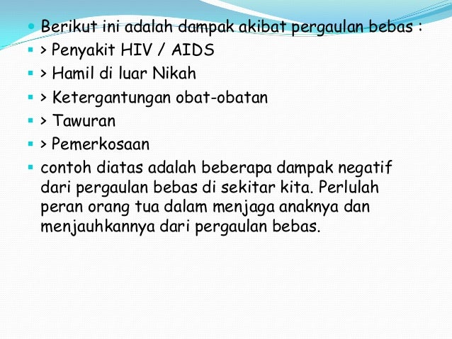 contoh diatas adalah beberapa dampak negatif dari pergaulan bebas di sekitar kita. Perlulah peran orang tua dalam menjaga anaknya dan menjauhkannya dari pergaulan bebas. -