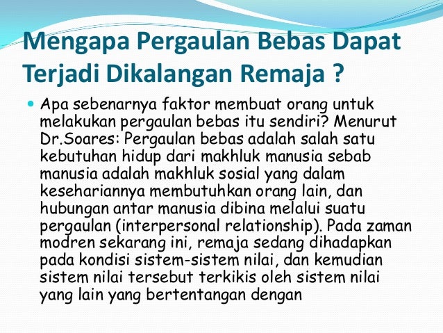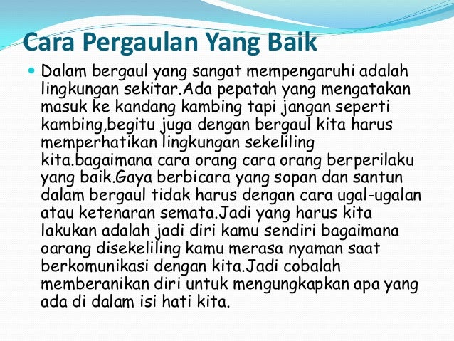 Cara Pergaulan Yang Baik Dalam bergaul yang sangat mempengaruhi adalah lingkungan sekitar.Ada pepatah yang mengatakan masuk ke kandang kambing tapi jangan seperti kambing,begitu juga dengan bergaul kita harus memperhatikan lingkungan sekeliling kita.bagaimana cara orang cara orang berperilaku yang baik.Gaya berbicara yang sopan dan santun dalam bergaul tidak harus dengan cara ugal-ugalan atau ketenaran semata.Jadi yang harus kita lakukan adalah jadi diri kamu sendiri bagaimana oarang disekeliling kamu merasa nyaman saat berkomunikasi dengan kita.Jadi cobalah memberanikan diri untuk mengungkapkan apa yang ada di dalam isi hati kita. - Mengapa Pergaulan Bebas Dapat Terjadi Dikalangan Remaja ? Apa sebenarnya faktor membuat orang untuk melakukan pergaulan bebas itu sendiri? Menurut Dr.Soares: Pergaulan bebas adalah salah satu kebutuhan hidup dari makhluk manusia sebab manusia adalah makhluk sosial yang dalam kesehariannya membutuhkan orang lain, dan hubungan antar manusia dibina melalui suatu pergaulan (interpersonal relationship). Pada zaman moderen sekarang ini, remaja sedang dihadapkan pada kondisi sistem-sistem nilai, dan kemudian sistem nilai tersebut terkikis oleh sistem nilai yang lain yang bertentangan dengan agama.